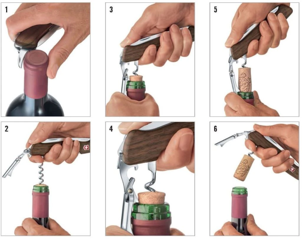 Un saca corchos extra largo de cinco vueltas evita que el corcho se rompa, además de una herramienta combinada única con una palanca de dos pasos para descorchar y un abridor de botellas.