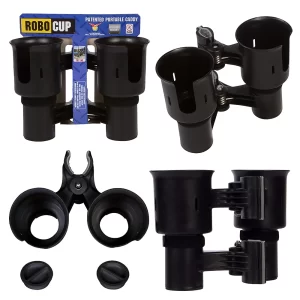 Robocup 07-101-B es un soporte patentado que sujeta de forma segura dos bebidas, herramientas, cañas de pescar, palillos de baterías, teléfono, llaves y mucho más, sujetándose instantáneamente a superficies redondas y planas de hasta 2” de tamaño.