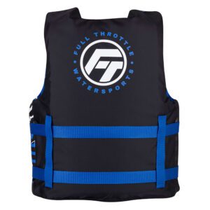 112200-500-002-22 Chaleco salvavidas de Full Throttle de nylon en color azul, le permite a los jóvenes nadadores una forma segura de disfrutar de sus actividades acuáticas, ya sea flotando, nadando, navegando o simplemente relajándose en el agua.