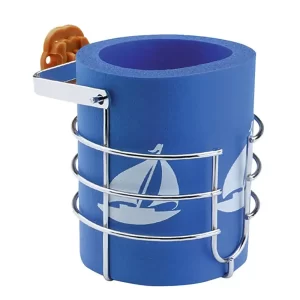 Portavasos fabricado con alambre de acero cromado, ideal para embarcaciones y vehículos recreativos. Cuenta con un soporte montar sobre superficies que hace que el posta vasos se balancee libremente, para mantener el nivel de las bebidas y evitar derrames.