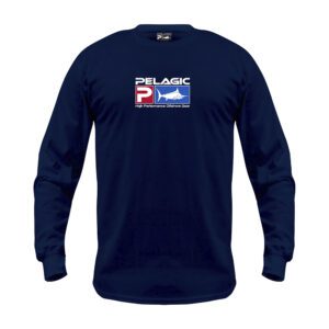 Audaz y soberbia, la playera de pesca de manga larga Deluxe LS presenta el icónico logo de Pelagic Deluxe al frente y uno más grande en la espalda.