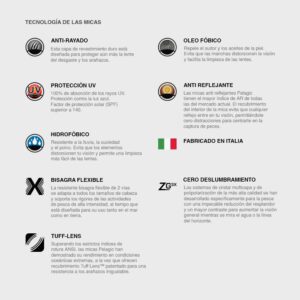 - Tuff-Lens: Superando los estrictos índices de rotura ANSI, las micas Pelagic han demostrado su rendimiento en condiciones oceánicas extremas, a la vez que ofrecen recubrimiento Tuff Lens™️ patentado para una resistencia a los arañazos inigualable.