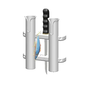 Estos porta cañas de pescar dobles cuentan con un soporte para cuchillos y señuelos. Tiene capacidad para varillas de hasta 1 ¾” (4.4 cm) de diámetro. Construido a partir de una sola pieza de polipropileno estabilizado a los rayos UV moldeado por inyección. No requiere ensamblaje. Se instala con cuatro sujetadores #8 (incluidos en el producto empaquetado en exhibición).