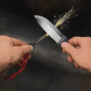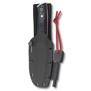 - Cuchillo de espiga completa con hoja trasera levemente filosa para encender el iniciador de fuego