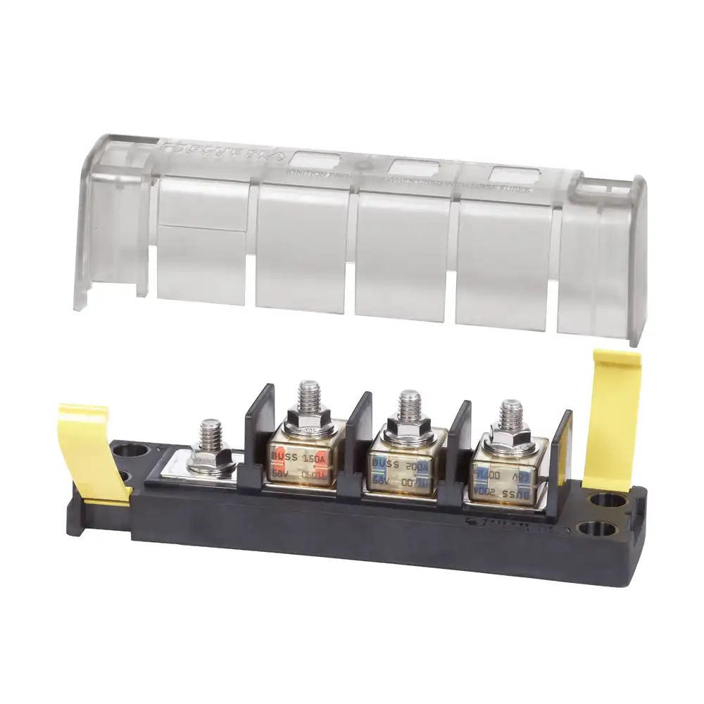 Este block de Fusibles 5196, te permite acomodar tres fusibles MRBF para una protección consolidada de circuitos de alto amperaje.
