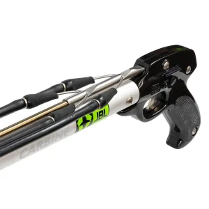 Están propulsados por bandas de Nitro d e1/2” de compound X. Estas bandas son un 20% más fáciles de cargar con la misma potencia que las bandas de la competencia. El Carbine cuenta con una empuñadura de perfil bajo que facilita la adquisición del objetivo. Así que, si requiere un arpón que le traiga muchos peces sin gastar tanto, el Carbine es la elección perfecta.