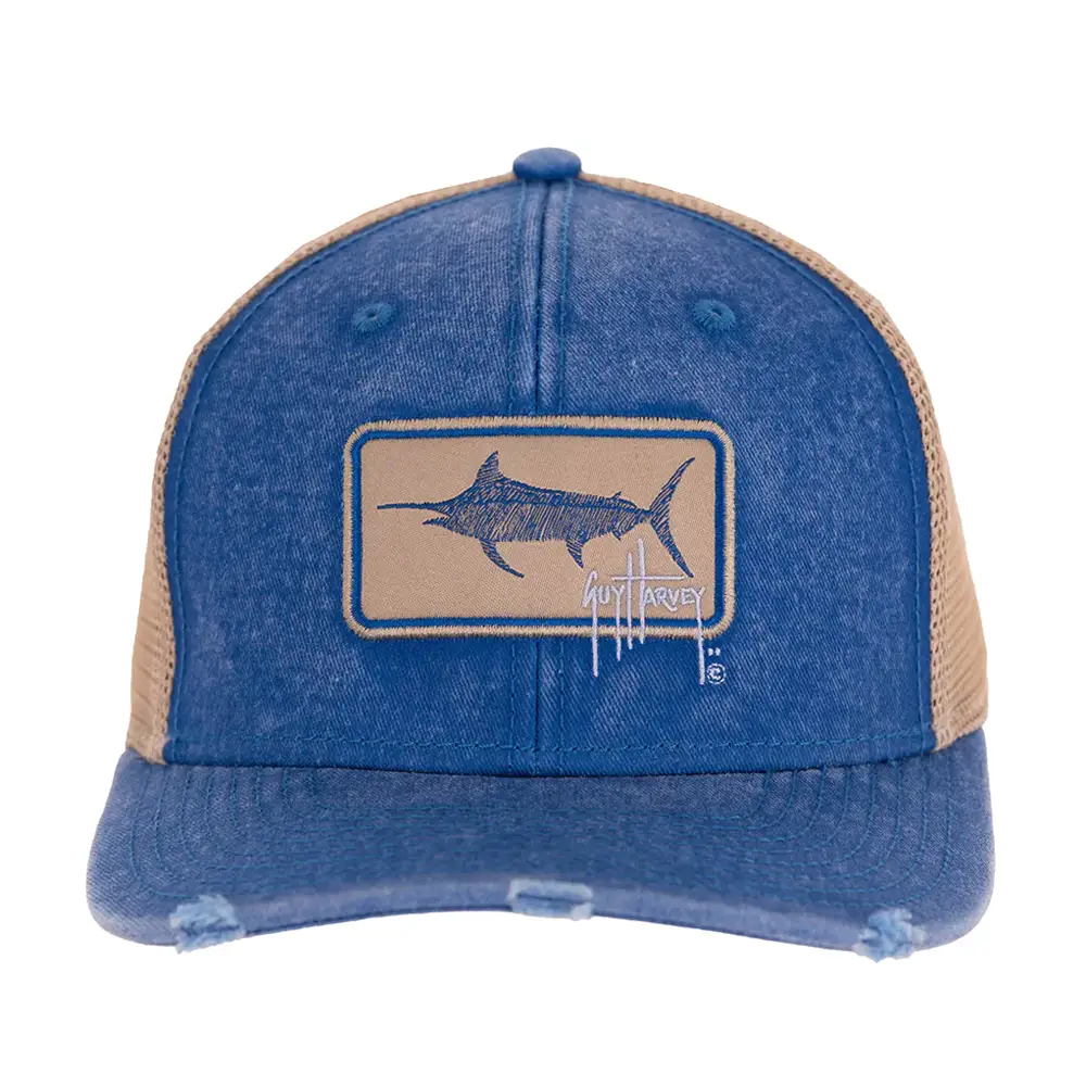 ¡Muestra al mundo que eres un auténtico pescador con esta gorra Trucker desgastada! Cuenta con el icónico logotipo de Guy Harvey en un parche de apariencia de cuero cosido.