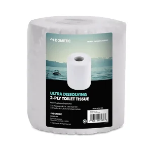 El papel higiénico ultrasuave de 2 capas de Dometic se disuelve rápidamente y evita los atascos, por lo que es ideal para los inodoros móviles de vehículos recreativos y barcos. Cada rollo contiene 500 hojas fabricadas con fibras 100% recicladas. No contiene perfumes ni colorantes.