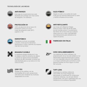 Obtén el nivel más alto de claridad óptica y precisión visual sin distorsiones al mismo tiempo que evitas rasguños (tecnología Tuff-Lens). Elimina drásticamente la neblina, el resplandor y los reflejos de luz no deseados que se encuentran dentro y fuera del agua gracias a su tecnología de polarización Zero-Glare (ZG3X™). Una de las ventajas de los lentes con tecnología PMG, son los recubrimientos hidrofóbicos y oleofóbicos en sus acabados, que permiten eliminar fácilmente el rocío marino, huellas dactilares y protectores solares a base de aceite, ofreciendo al mismo tiempo protección adicional contra los rayos UV directos y reflejos de sol.
