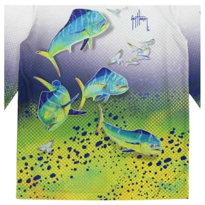 Ahora, cuando tu pequeño desee quedarse afuera por más tiempo, no te importará si lleva puesta esta increíble playera de protección solar de rendimiento de Guy Harvey.