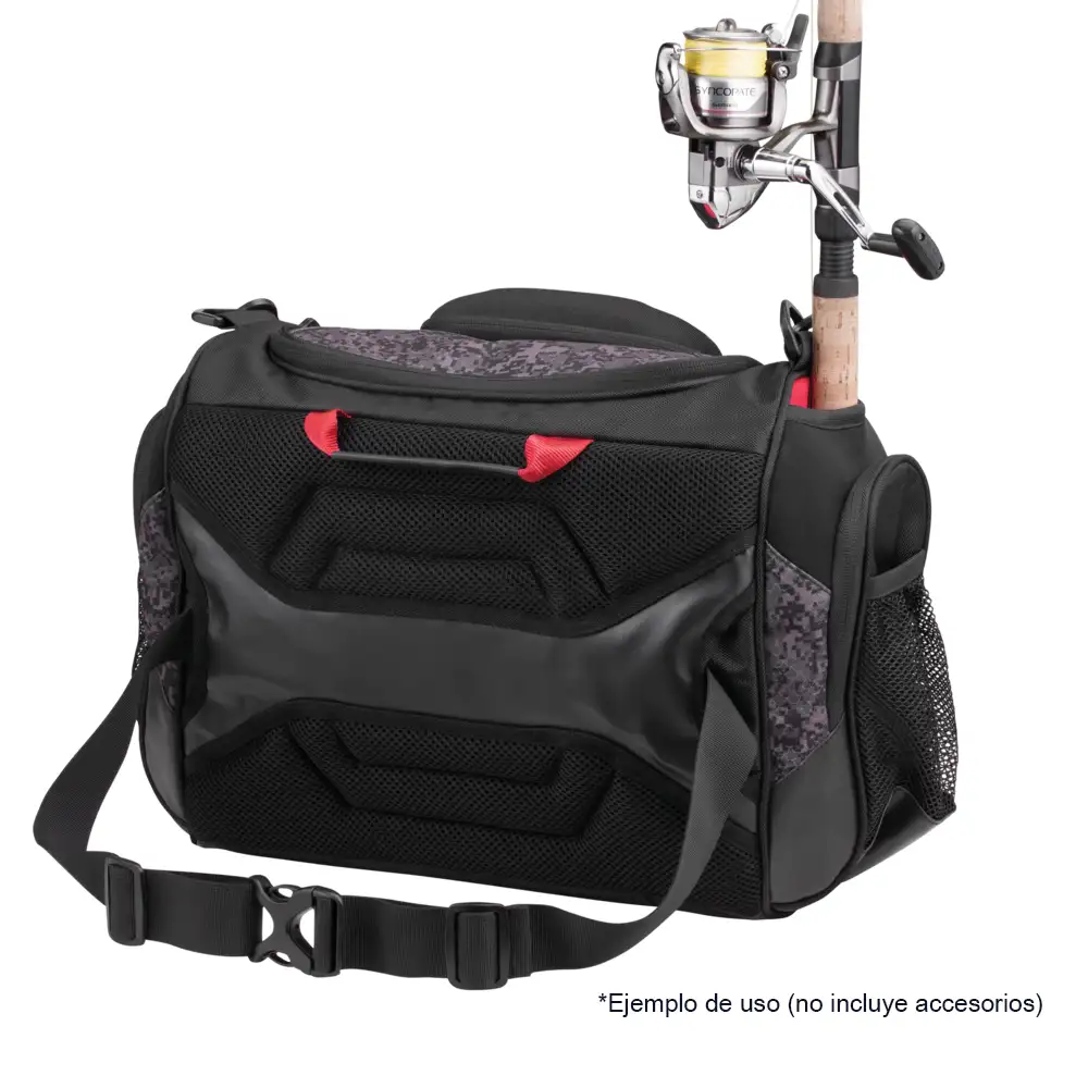 Esta maleta para pesca cuenta con varios puntos de sujeción en el exterior para tus herramientas, un bolsillo rígido moldeado de EVA para las gafas de sol, un sistema portacañas a ambos lados y una correa para el hombro acolchada, ajustable y de malla 3D muy cómoda.