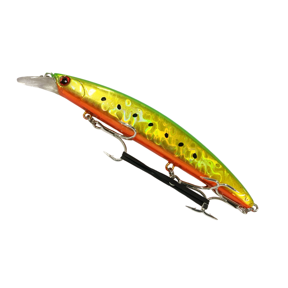 Este es un señuelo tipo Minnow Sinking diseñado para la pesca de especies depredadoras en agua salada. Su cuerpo de 120 mm está fabricado con materiales de alta resistencia y cuenta con un acabado holográfico de alta calidad que imita con precisión el brillo y movimiento de una sardina o anchoveta, lo que lo hace irresistible para especies como corvina, lenguado y róbalo.