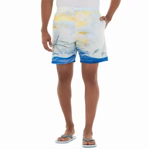 Este short Sunrise Sailfish cuenta con las ilustraciones originales de Guy Harvey en un diseño envolvente de un pez vela.